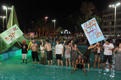 דיירי האוהלים בנתניה נכנסו להתרענן במזרקה (צילום: עידו ארז)