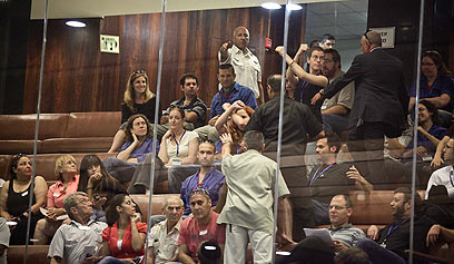 שלושה ממארגני מחאת האוהלים, ביניהם סתיו שפיר, שישבו ביציע הקהל במליאת הכנסת, הוצאו מהאולם במהלך ההצבעה, לאחר שנעמדו והצליבו את ידיהם בתנועה שהפכה לסמל המחאה.
