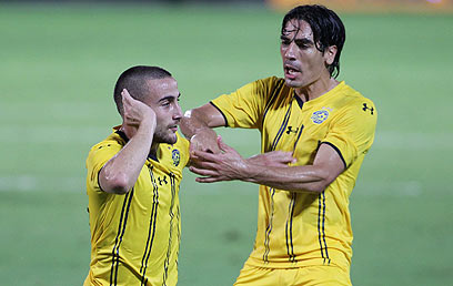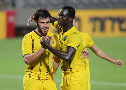 קונאטה וקולאוטי חוגגים את היתרון הראשון של מכבי (ראובן שוורץ)