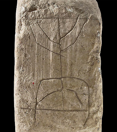 כמו כן, באותה חפירה בעפר שמתחת לרחוב, בצד תעלת הניקוז, נמצא כלי אבן שעליו חריטה נדירה של מנורה.