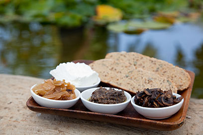 מימין לשמאל: פטריות צלויות, הממרח המוכן ובצל מטוגן (צילום: דניאל לילה)