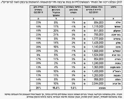 עליות המחירים ביחס לרבעון שעבר מתגמדות לעומת העליות שחלו בשיעור שנתי. השוואה לרבעון השני של 2010, מדובר בעלייה של 2%-21% במחירי הדירות בכל הערים שנבדקו, בעיקר בצפון ובדרום הארץ.