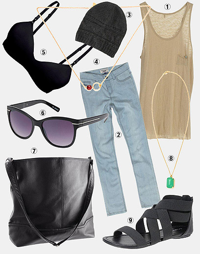 איך תעשי זאת בעצמך: פריט המפתח הוא גופיה או חולצה בגוון בז' ואותה תשלבי עם ג'ינס נקי, ללא קרעים. חזייה איכותית בצבע שחור תפתור את בעיית השקיפות, שרשראות יוסיפו עניין ואל תשכחי את הכובע, גם אם עדיין חם אצלנו, כי אחרי הכל בשביל להיראות טוב צריך גם לסבול לפעמים.
