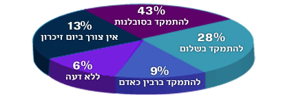 לדעת 43% מהמשיבים הנושא המרכזי ביום הזה צריך להיות "ערך הסובלנות". 28% מעדיפים להתמקד בשלום ו-9% ברבין כאדם.