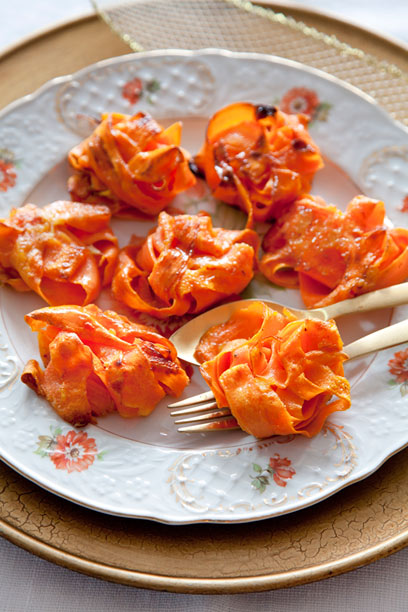 הן נראות כמו פרחי גזר, זוהרים וכתומים, והסוד שלהן, הפשוט מאוד לתפעול, הוא בסך הכל קולפן מעולה. בעזרת הקולפן יוצרים מהגזרים רצועות ארוכות. אחר כך מצפים אותן במעטה דקיק של בלילה עדינה, ומטגנים במחבת, כשהרצועות מקופלות בערמות קטנות שנראות כמו פרחים.