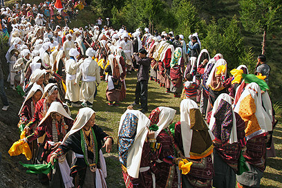 כל אישה החזיקה בידה האחת ב-Ril, מוט עץ המשמש לדחיסת השטיח על נול האריגה, ובידה השנייה במטפחת צהובה או ירוקה. הגברים היו חמושים בפגיונות ומגנים. התהלוכה סבבה סביב מגרש האירועים ואז טיפסה במדרגות אל הכביש הראשי המוליך לכפר. כשהם מנגנים, שרים ורוקדים, הדהדו הקולות בעמק.