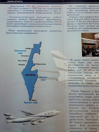 עלונים הנושאים לוגו של חברת אל על ומחולקים לציבור הנוסעים ברוסיה, מכילים מפה של ישראל שממנה נעדרים שטחי יהודה ושומרון והגולן.