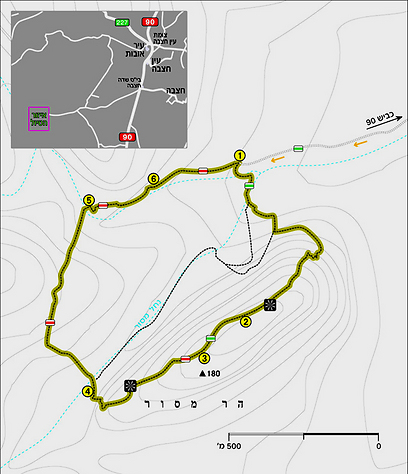 הר מסור מתנשא לגובה של 180 מ' מעל פני הים, והנוף שנשקף מכאן מלא עוצמה והוד. כשמגיעים לראש המסור רואים מנגד את הירידה - שתלולה לא פחות מהעלייה. תפאורה זאת עלולה לעורר פחד, וליתר ביטחון כדאי לרדת את המטרים הראשונים בשפשוף מכנסיים. המסלול, שצבעו הופך בראש ההר לאדום (3), יורד אל הערוץ שבו צעדנו קודם (4), ומיד יש טיפוס על שלוחה נמוכה שמפרידה ביננו ובין נחל מסור.