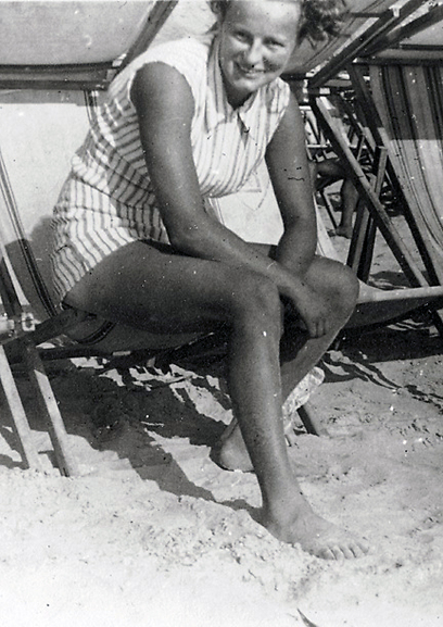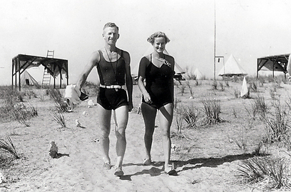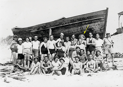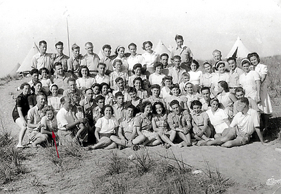 10-8. אמירה יצאה גם להדרכה של קבוצות בנופש ליד חופי הים. בתצלום קבוצה בקיסריה, 1943