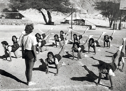 14. בשנותיה הראשונות של המדינה הוקמה חוות גדנ"ע בבאר אורה שבדרך אילת. תלמידי הריאלי יצאו לאימונים במקום. בתצלום: אמירה בשיעור התעמלות בבאר אורה