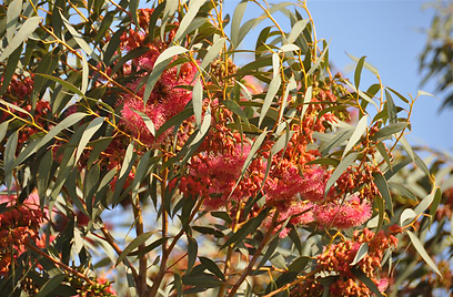 אדום לצד ירוק. פריחת עצי האיקליפטוס