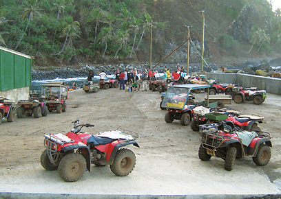 כשרגלינו דרכו על אדמת האי – היינו רטובים עד לשד עצמותינו. ברנדה החתימה את הדרכונים בחותמת המיוחדת ועשתה לנו סיבוב היכרות מהיר על גבי טרקטורון. הרכבים הממונעים היחידים באי הם טרקטורונים, טרקטור אחד ומשאית קטנה.