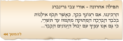 הפיוט נאמר בקהילות אשכנז לאורך כל חזרת הש"ץ, לאחר "קדושה". אבל אין ספק שבשעת המנחה - כאשר הגוף כבר תשוש - הנשמה מבקשת רחמים קצת אחרת. כאן – בנוסח אשכנז, הפופולרי בבתי הכנסת וגם כאן כפי ששרים "פרחי לונדון". והנה עוד תפילה קטנה, של רחל חלפי.