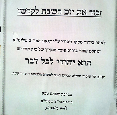 בשבוע שעבר זימן אליו הרב זולדן את בוריס, ובסיום פגישתם נתלתה בבית המדרש מודעת אזהרה. תחת הכותרת "זכור את יום השבת לקדשו", נכתב: "לאחר בירור מקיף ויסודי על ידי הגאון המו"צ (מורה צדק) שליט"א, הוחלט שמר בוריס, עובד הניקיון של בית המדרש, הוא יהודי לכל דבר, ועל כן חל איסור מוחלט לבקש ממנו לעשות מלאכות איסורי שבת".