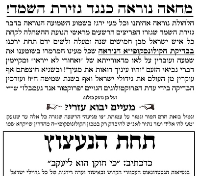 המודעה נכתבה, כביכול, נגד אלה הזוממים "לשים ידם תחת ירכנו" ולערוך לכל בני החמישים ומעלה את "בדיקת הקולונסקופי"א הנוראה". בכך הם עוברים על איסור התורה "ואחורי לא יראו" ו"עוקרים מן העולם את גידולי ישראל אף בשנת השמיטה". החלופה: מכון מהדרין בשם "תחת הנעצוץ" של "הגסטרונאוט העכוזרי הקדוש" ובאישור "ועדה ריחנית" - על פי הפסוק "כי חוקן הוא ליעקב", המציע, בין היתר, "הסרת גידולים על מצע מנותק".