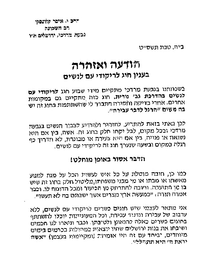 בראשית השבוע פרסמנו כי נורית מלמד, כוריאוגרפית ומורה לריקוד במקצועה, הפעילה חוג ריקודי-עם בשכונת גבעת מרדכי בבירה. אל רב המקום, איסר קלונסקי - מהבכירים בציבור הדתי-לאומי בירושלים – הגיעו תלונות כי היא מקיימת קשרים רומנטיים עם נשים, שאחת מהן אף עזבה למענה את משפחתה. לפיכך החליט הזהיר את הציבור מפניה - עד שהוחרמה ופרנסתה נפגעה.