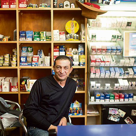 "איזה יצאו. אבל הנה, תראה איך כולם מפחדים עכשיו, גם הערבים. הבחור הזה הוא קליינט קבוע אצלי, מגיע פעמיים־שלוש בשבוע, אבל עכשיו הוא מפחד לבוא לפה. בגלל המצב כל הערבים חשודים עכשיו. 'ידיים למעלה, תרים חולצה, תוריד מכנסיים'. הם מרגישים מושפלים. רוב הקליינטורה שלי זה ערבים מחברון, בית־לחם והכפרים באזור. הם מזמינים אותי לחאפלות שלהם. לפני הבלגן הייתי בחאפלה ענקית בחלחול. היה על הכיפאק. אבל במצב של היום לא הייתי הולך, כי אי־אפשר לדעת מאיפה זה יבוא לך. ראיתי מכאן כמעט את כל הפיגועים שהיו פה. זה המקום הכי חם היום בארץ. דוקרים אותנו, דורסים, יורים. פלא שלא נכנסים אליי אנשים יותר? פחד אלוהים כאן. הנה, כמה זמן אתם אצלי, יותר משעה? מה מכרתי? כלום!"