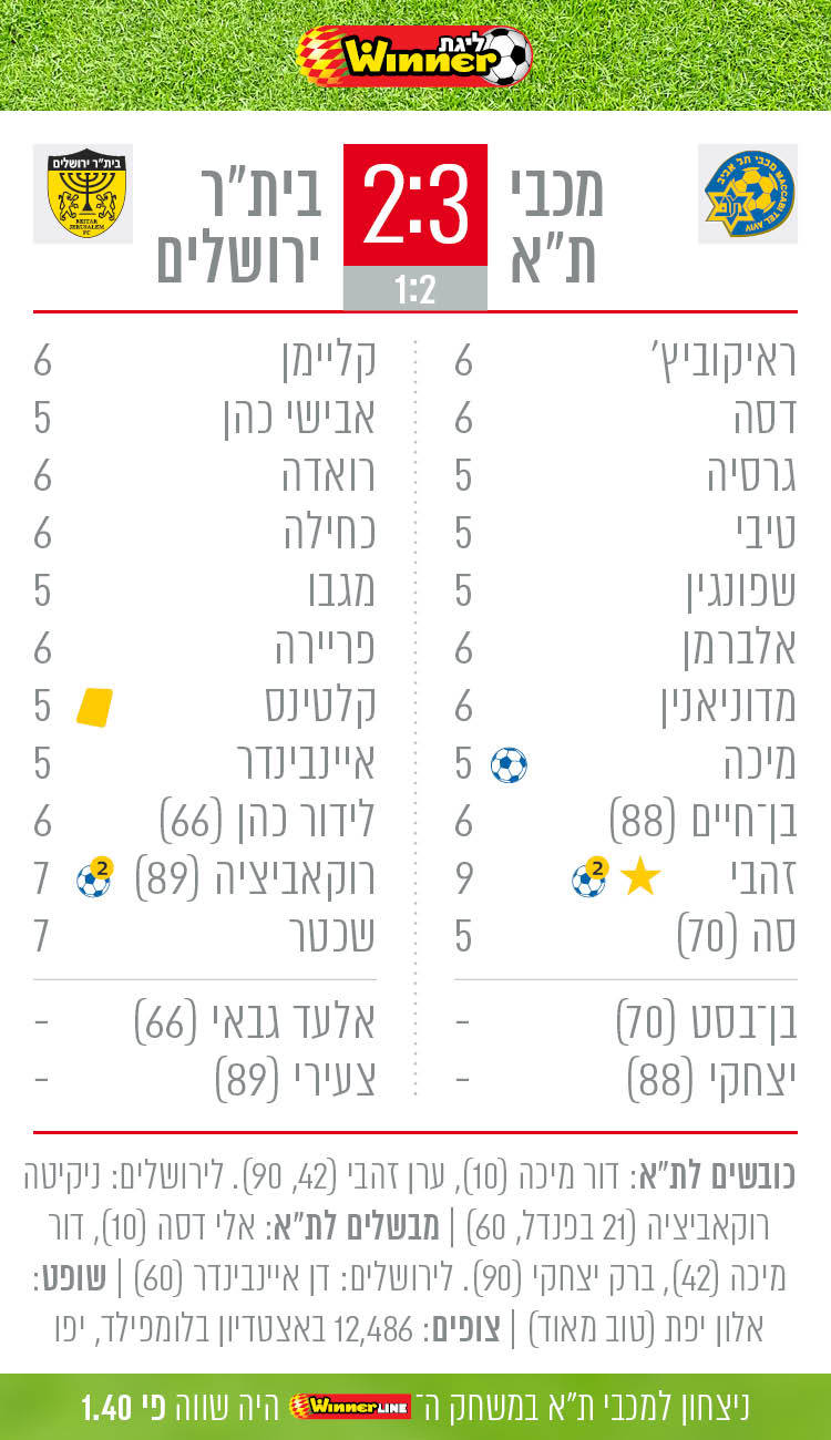 מעבר להיסטוריה, השער השני של זהבי בדקה ה־90 סידר למכבי ת"א ניצחון 2:3 על בית"ר ירושלים והעפלה למקום הראשון בטבלה על חשבון הפועל באר־שבע.