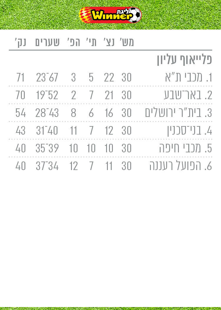 1. החזרה לפסגה. מאז ה־21 בדצמבר 2015, כשבאר־שבע הגיעה לבלומפילד וניצחה את מכבי ת"א בדרך להעפלה למקום הראשון, הצהובים לא הצליחו לחזור לפסגה. במשך 15 מחזורים, יותר מ־100 ימים, הם ראו את הגב של האדומים מהנגב. באר־שבע כבר הובילה בחמש נקודות על מכבי, שישה מחזורים לסיום העונה הסדירה, עד שהשתנקה דווקא במשחקי הבית ומכבי הצליחה לעבור אותה בנקודה.