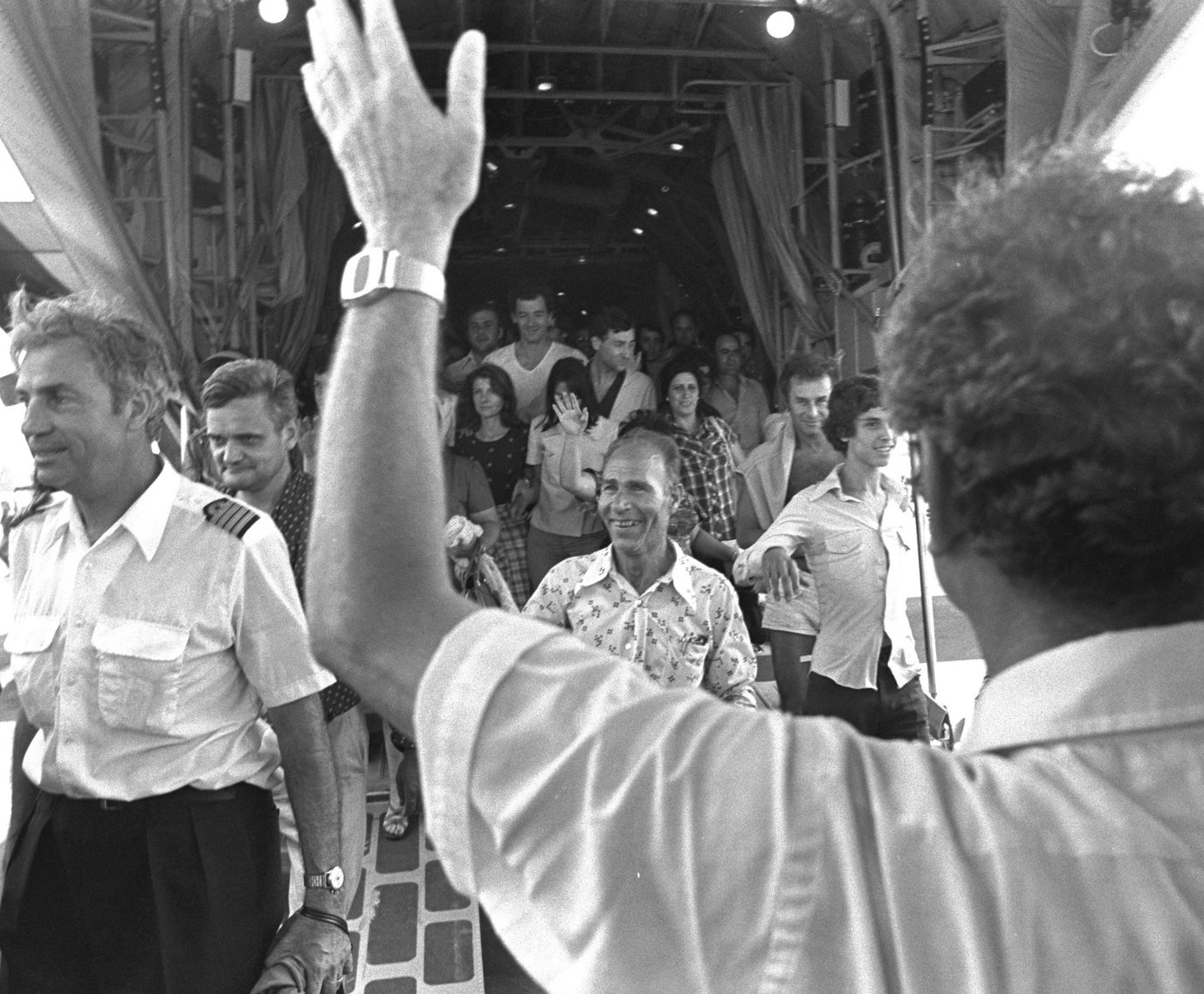 יגאל אלון (עם הגב למצלמה) מברך את נוסעי טיסת אייר פראנס שנחטפה בירידה ממטוס ההרקולס בנתב"ג