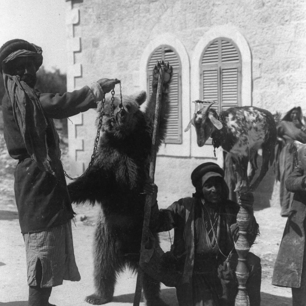 צילום נדיר של קרקס רחוב של חיות מאולפות, קוף, עז ודוב, במופע רחוב בירושלים, בתקופה העותומנית בארץ ישראל