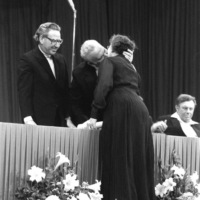 נשיא המדינה הרביעי של מדינת ישראל אפרים קציר בנשיקה מחוץ לפרוטוקול בטקס הענקת פרס ישראל לראש הממשלה לשעבר גולדה מאיר ביום העצמאות בשנת 1975 | אוסף התצלומים הלאומי נשלח על ידי איתמר אייכנר