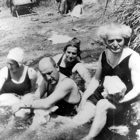 תמונה נדירה של ראש הממשלה המנוח דוד בן גוריון עם אליעזר קפלן משתכשכים להנאתם במים בעין פשחה לחוף ים המלח, 1940.
