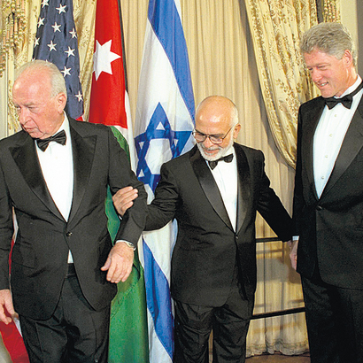ביקור ראש הממשלה יצחק רבין בארה"ב. בצילום, חוסיין מלך ירדן אוחז בזרועו של ראש הממשלה לאחר מעידה קלה, באירוע חגיגי אשר ערך נשיא ארה"ב ביל קלינטון לאחר החתימה על הסכם וושינגטון בין ירדן לישראל. נשלח על ידי איתמר אייכנר