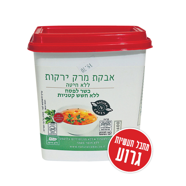 הקטגוריה היחידה בה מצאנו מוצר אחד עם ערכים תזונתיים של ממש גרועים: אבקת מרק ירקות ללא חיטה natural cake, מתבל תעשיות מזון (19.70 שקל ל־400 גרם בשופרסל דיל). ב־100 גרם: 14,235 מ"ג נתרן. במנת היצרן (100 מ"ל מרק מוכן): 427 מ"ג נתרן. במנה שלנו (11 גרם): 1,566 מ"ג נתרן.
