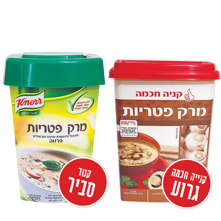 סביר: מרק פטריות לתיבול קנור, יוניליוור (18.90 שקל ל־400 גרם ברמי לוי). ב־100 גרם: 4,230 מ"ג נתרן. במנה: של 11.3 גרם (לפי הצהרת היצרן): 478 מ"ג. מרק פטריות לתיבול, שופרסל (15.80 שקל ל־400 גרם בשופרסל דיל). ב־100 גרם: 4,633 מ"ג נתרן. במנת היצרן (5.5 גרם): 255 מ"ג. בכף שלנו: 510 מ"ג נתרן.