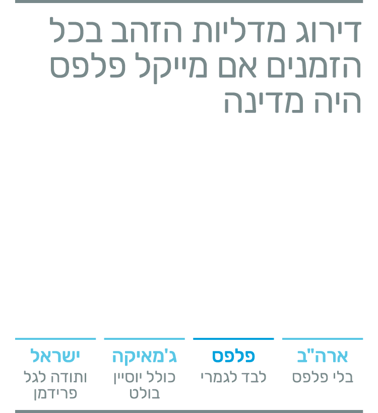 כאשר מייקל פלפס, 31, סיים את שחיית הניצחון שלו, שלשום בחצות, שעון ריו, הוא העיף מבט אל־על, אל התינוק שלו ביציע או אל היושב במרומים, וזקר אצבע כאומר: אני מספר 1. פניו נהרו באושר עילאי. זאת הייתה מדליית הזהב האולימפית ה־21 שלו (מתוך 25). שום ספורטאי לא הגיע לצבר כזה של מדליות לפניו, וספק אם יקום אי־פעם ספורטאי שיגיע להישג דומה אחריו. הוא ידע: אולימפיאדת ריו רשומה על שמו, נכון לפחות לששת הימים הראשונים. מייקל פלפס מצד אחד, ומצד שני כל השאר.