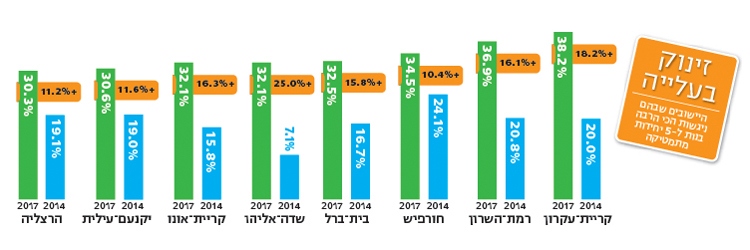 מפילוח הנתונים לפי רשויות מקומיות עולה כי קריית־עקרון ממוקמת במקום הראשון בעלייה בנבחנות בחמש יחידות במתמטיקה עם 38.2 אחוזים לעומת 20 אחוזים בשנת 2014 — עלייה של 18.2%, אך יש לציין כי זה מיוחס לאולפנת פלך לבנות. במקום השני רמת־השרון, לאחר מכן חורפיש ובית־ברל. גם צוות ההוראה בתיכון אמי"ת בבית־שמש הוכיח שעם רצון ואכפתיות ניתן לפרוץ את המחסום ולהוביל את התלמידות להישגים גבוהים.