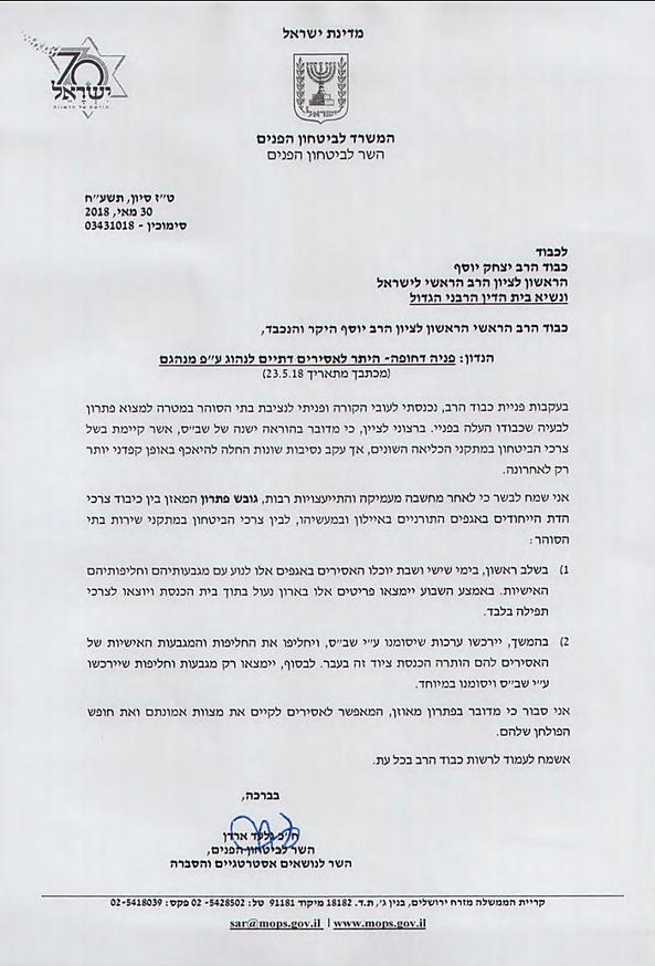 לפני כשבוע, כאמור, כתב "הראשון לציון" לשר הממונה וביקש את התערבותו לאחר ש"אל לשכתי הגיעו פניות בעניינם של אסירים דתיים וחרדים, בבתי הסוהר ובייחוד בבית הסוהר 'מעשיהו', אשר נאלצים בעת האחרונה בעקבות הוראה חדשה להתפלל ללא מגבעת וחליפה כפי מנהגם".