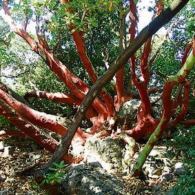 • זיהוי מהיר: מעבר לגזעו הבולט באדמומיותו, זהו עץ נמוך־קומה (עד חמישה מטרים ברוב המקרים) ועליו גדולים ומבריקים בירוק עז. לעיתים הקליפה מתקלפת ומשווה לעץ מראה של יצירת אמנות.