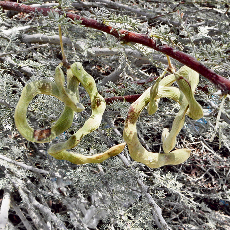 • זיהוי מהיר: הפירות בצורת תרמיל מסולסל. העץ קוצני מאוד, נמוך יחסית, ומרחוק נראה כמו שמשייה שטוחה.