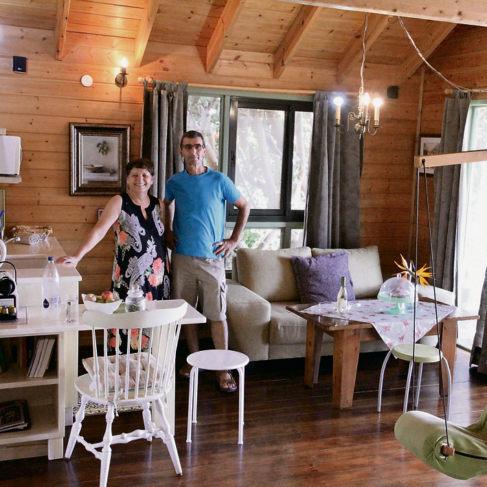 למה צימר חברתי: "מאז שהתחתנו לוי כל הזמן היה אומר לי שהוא רוצה שתהיה לנו איזה יחידת חסד של הכנסת אורחים", מספרת מלי. "האמת שלא יכולנו לממש זאת בשנותינו הראשונות כי עברנו 7 דירות ב־4 שנים. בשבילנו כל מעבר היה בונבוניירה ועשה לנו טוב, אבל בהחלט לא איפשר להגשים את החלום הלא ברור הזה. בכל פעם שחיפשנו היכן לגור, דמיינו אם יתאפשר שתהיה יחידה כזו. לא ידענו מה היא תהיה בסופו של דבר. דווקא כשעברנו למעלה אפרים חשבנו שהחלום הזה יתפוגג כלא היה. לאחר כמה חודשים זיהינו בצד השמאלי של הבית יחידת הורים, אבל מההתחלה לא הסתדר לנו לישון במרחק מאוד גדול מהילדים. חששתי שלא נשמע אותם אם יתעוררו בלילה וכדומה. החלטנו לבטל אותה ואולי להשתמש בה כיחידה להשכרה לאדם בודד, והאמת זכינו שהייתה אצלנו מישהי שהשתמשה ביחידה כמספר חודשים והייתה זקוקה לה מאוד. כך התחיל להירקם החלום מחדש. פתאום קלטנו שממש לנגד עינינו נמצא החלק אליו כה ציפינו והתחלנו לשפץ את היחידה מכספנו".