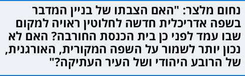 "התוכנית שלו לא עמדה לבחינה של ממש אל מול המציאות, ויכול מאוד להיות שהיא הייתה בעייתית הרבה מעבר למה שמשערים", טוען מלצר. "האם הצבתו של בניין המדבר בשפה אדריכלית חדשה לחלוטין ראויה למקום שבו עמד לפני כן בית הכנסת החורבה? האם לא נכון יותר, מבחינה אדריכלית, לשמור על השפה המקורית, האורגנית, של הרובע היהודי ושל העיר העתיקה?"
