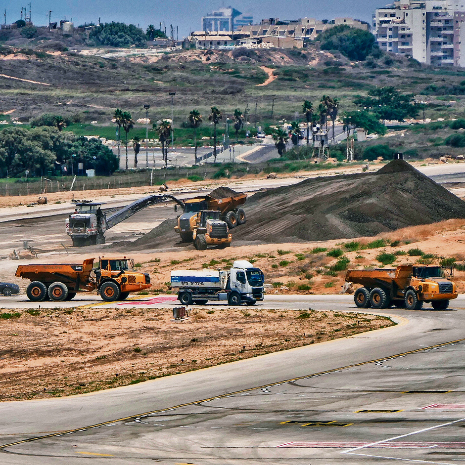 מסלול מס' 2103, שאורכו 1,741 מטרים, הומה. אבל לא משאון המטוסים הנוחתים והממריאים אלא מהרעש הנפלט ממנועי הכלים הכבדים שעוסקים בהריסתו. המחפרונים חורצים את משטחי האספלט, הבולדוזרים מסייעים – והערמות האדירות של רסק האבנים מועמסות על גבי משאיות. "עובדים, ובקצב", אומר מנהל העבודה טומי.