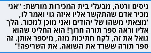 "אני מכיר אדם שהתקשר אליו איזה גוי ואמר לו, 'מצאתי איזה משהו של יהודים ואני מוכן למכור", אומר ניסים. "הלך אליו וראה ספר תורה חרוך! הוא החליט שהוא גואל את זה, לקח חתיכות מזה, מיספר אותן. זה ספר תורה ששרד את השואה", עיניו מתערפלות. "את השריפה. זה בעיניי משהו שואתי".