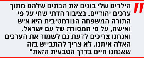 “זה נושא מאוד עדין, מאוד רגיש, מאוד מורכב. במיוחד אצל ילד דתי שהתורה אומרת לו ככה והנטייה אומרת אחרת. בשורה התחתונה אני לא יכול להגיד לו לעשות משהו נגד התורה שלי, אבל אני קשוב להתלבטויות ומבין אותם”.