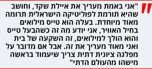 “תראי, אני באמת מעריך את איילת שקד, אני חושב שהיא תורמת לפוליטיקה הישראלית תרומה מאוד מיוחדת. בעלה הוא טייס מילואים בחיל האוויר, אני יודע מה זה כשהבעל טייס והוא הולך למילואים, זה השקעה של בית ואני מאוד מעריך את זה. אבל אם מדובר על מפלגה ציונית דתית צריך שיעמוד בראשה מישהו מהעולם הדתי”.
