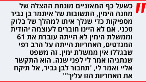 “כשעל כף המאזניים מונחת ההצלה של מחנה הימין, התשובות שלו מספיקות כדי שנלך איתו למהלך של בלוק טכני. אם לא היינו חוברים לעוצמה יהודית וממשלת הימין לא הייתה עוברת את 61 המנדטים, האחריות הייתה על הרב רפי שבגללו אין מממשלת ימין. זה משפט שנתניהו אמר לי לפני שנה. הוא התקשר אליי ואמר לי, ‘תחבור לבן גביר, אל תיקח את האחריות הזו עליך’”.