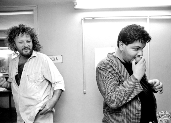 "שנת 93'. ב־1991 הקימו ארקדי דוכין ומיכה שטרית את 'החברים של נטאשה'. התמונה צולמה בתיאטרון צוותא. ארקדי הגיע להופיע כאורח שלי. שרנו יחד על הבמה שיר שארקדי כתב לאריק איינשטיין. ארקדי היה מופלא, כל התקופה הזאת הייתה מופלאה. הקלטתי שישה שירים שלו שנכללו באלבום, הוא היה יחסית בתחילת דרכו. התמונה צולמה לפני העלייה לבמה".
