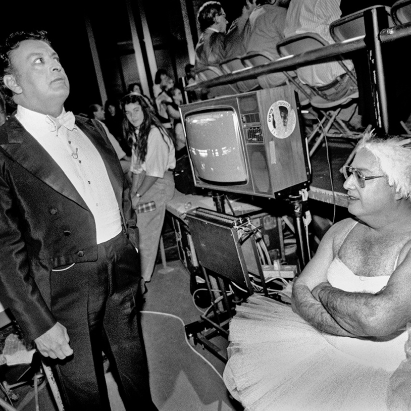 "כשאני רואה היום את הצילום הזה, רואים שאני לא יודע שהוא מצלם אותי. אני בסוג של הכנה של הפרימה בלרינה שבי. לקחתי את ההופעה שם מאוד ברצינות, וצפייה בתמונה החזירה אותי להכנה המנטלית והפיזית הקשה, למופע הבלרינות הזה. בלט קלאסי לא כל כך מתאים למשקל שלי, ואת הרעיון למופע הזה העלתה גליה גוטמן שהייתה אז מפיקה בערוץ הראשון. מי שקיבלה אותי בזרועות פתוחות לפרויקט הזה הייתה ברטה ימפולסקי — מנהלת הבלט הישראלי דאז. זובין מהטה ודן שילון גם כן התלהבו מהרעיון והצטרפו. אני, כמעט בלי לחשוב, הבנתי שמה שאני צריך לעשות זה לשקוד על הריקוד, להתאמן קשה ולהיות חלק מרביעיית הברבורים. נאלצו לתפור לי טוטו מיוחד של בלרינות. ב־12 ימי עבודה מרוכזים ואינטנסיביים מאוד הורדתי 7 קילו. היו אלה שנות ה־80, ממשלת הרוטציה פרס־שמיר. דווקא אז היינו אור לגויים. לדוגמה אישית יש ערך עליון. אני מקווה שנצליח להשריש את הערכים של פעם. חשוב לנו להנחיל את הערכים האלה לדור הבא".