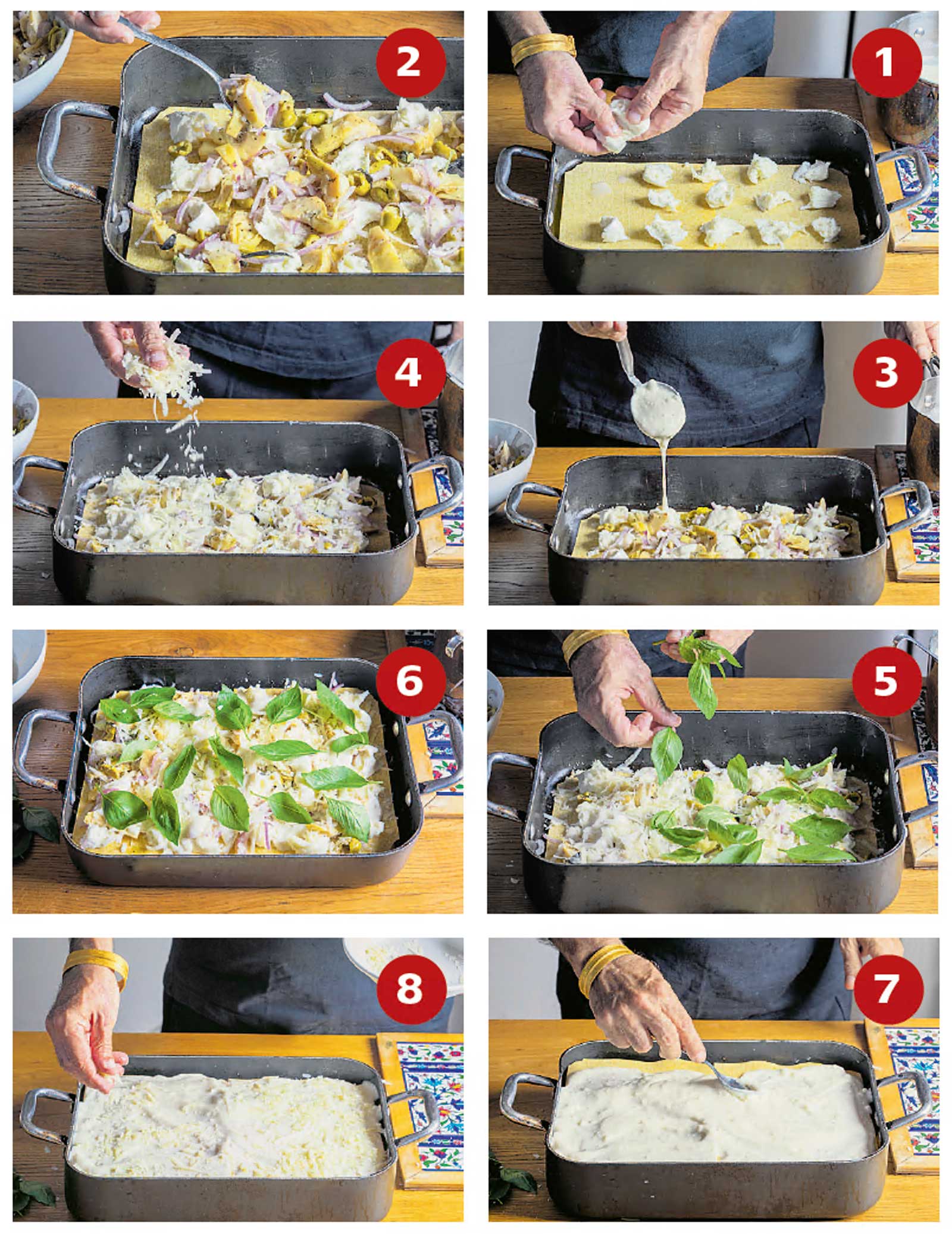 3. מפזרים מעל מחצית מתערובת הארטישוק. (צילום 2)